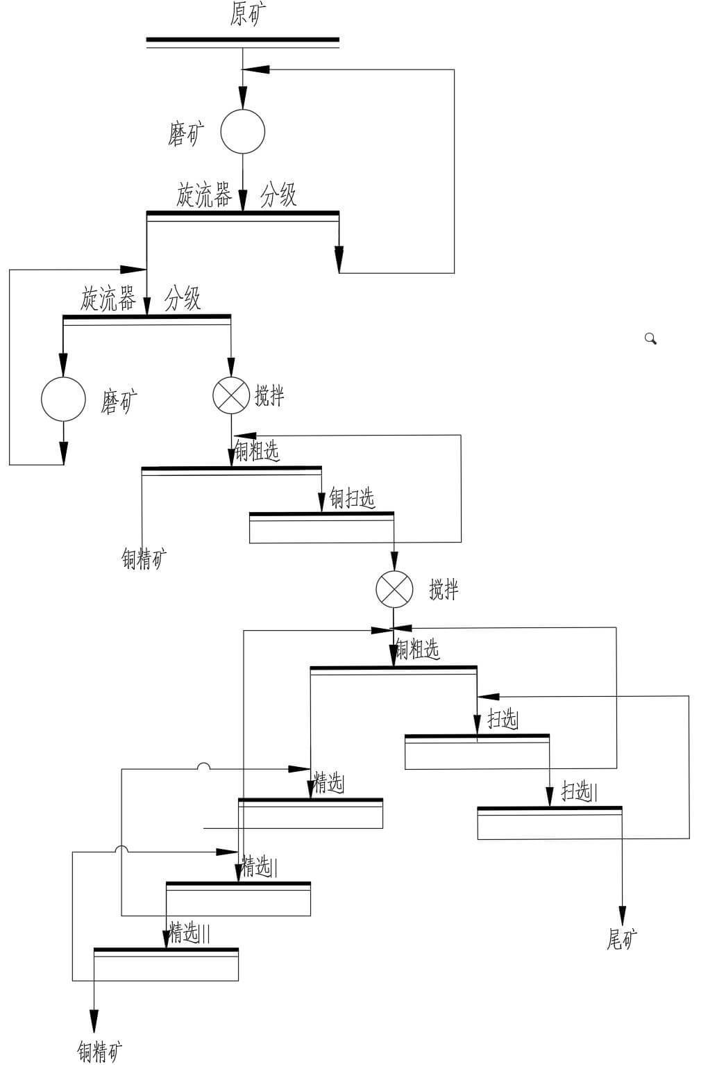 铜矿在自然界中种类繁杂,矿物结构也复杂多样,嵌布粒度为不等粒嵌布,粒级跨越中、微、细三个粒级,以中、细粒为主。铜矿主要包括自然铜、硫化矿、和氧化矿。浮选作为铜矿石选矿常用的一种工艺流程,既可用于选别硫化铜矿也可用于选别氧化铜矿,铜矿浮选主要流程大致为:矿石的破碎筛分→阶段磨矿阶段浮选→浓缩脱水→铜精矿。